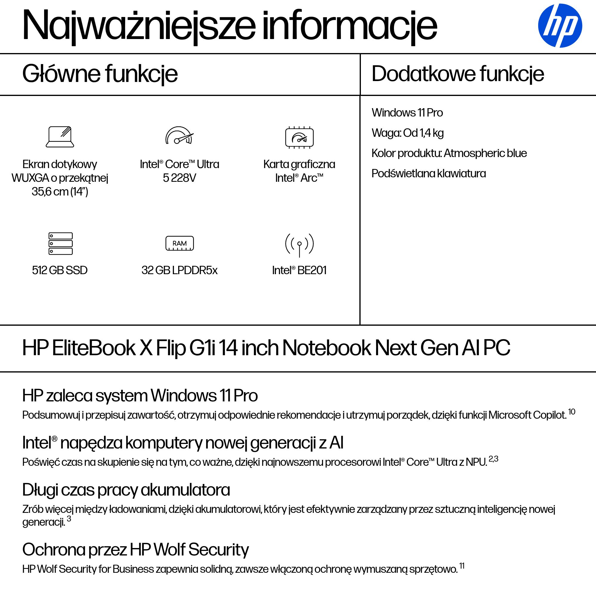 HP EliteBook X Flip G1i Next Gen AI PC Copilot+ PC Intel Core Ultra 5 228V Hybryda (2w1) 35,6 cm (14") Ekran dotykowy WUXGA 32 GB LPDDR5x-SDRAM 512 GB SSD Wi-Fi 7 (802.11be) Windows 11 Pro Niebieski