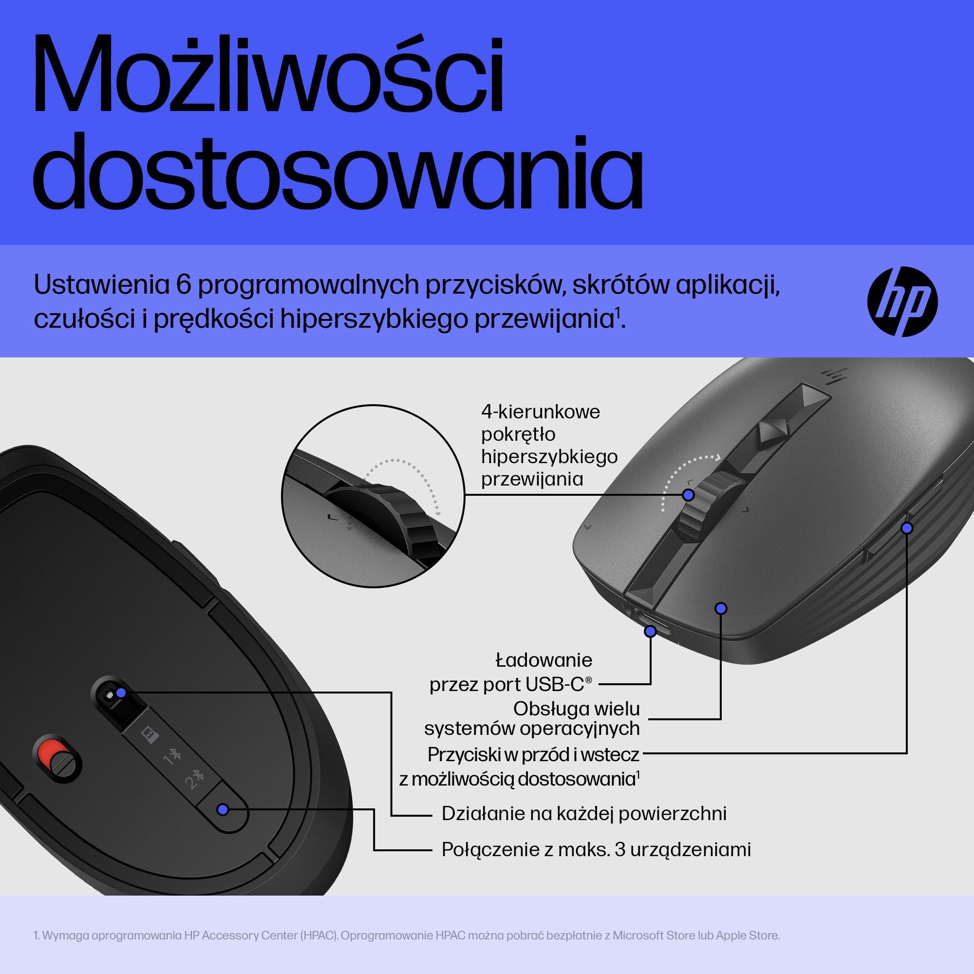 Dopasuj 6 programowalnych przycisków do siebie i swojego stylu pracy za pomocą aplikacji HP Accessory Center[4]. Twórz skróty do aplikacji, dostrajaj czułość, kalibruj szybkość przewijania i wiele więcej, aby zmaksymalizować swoją produktywność.