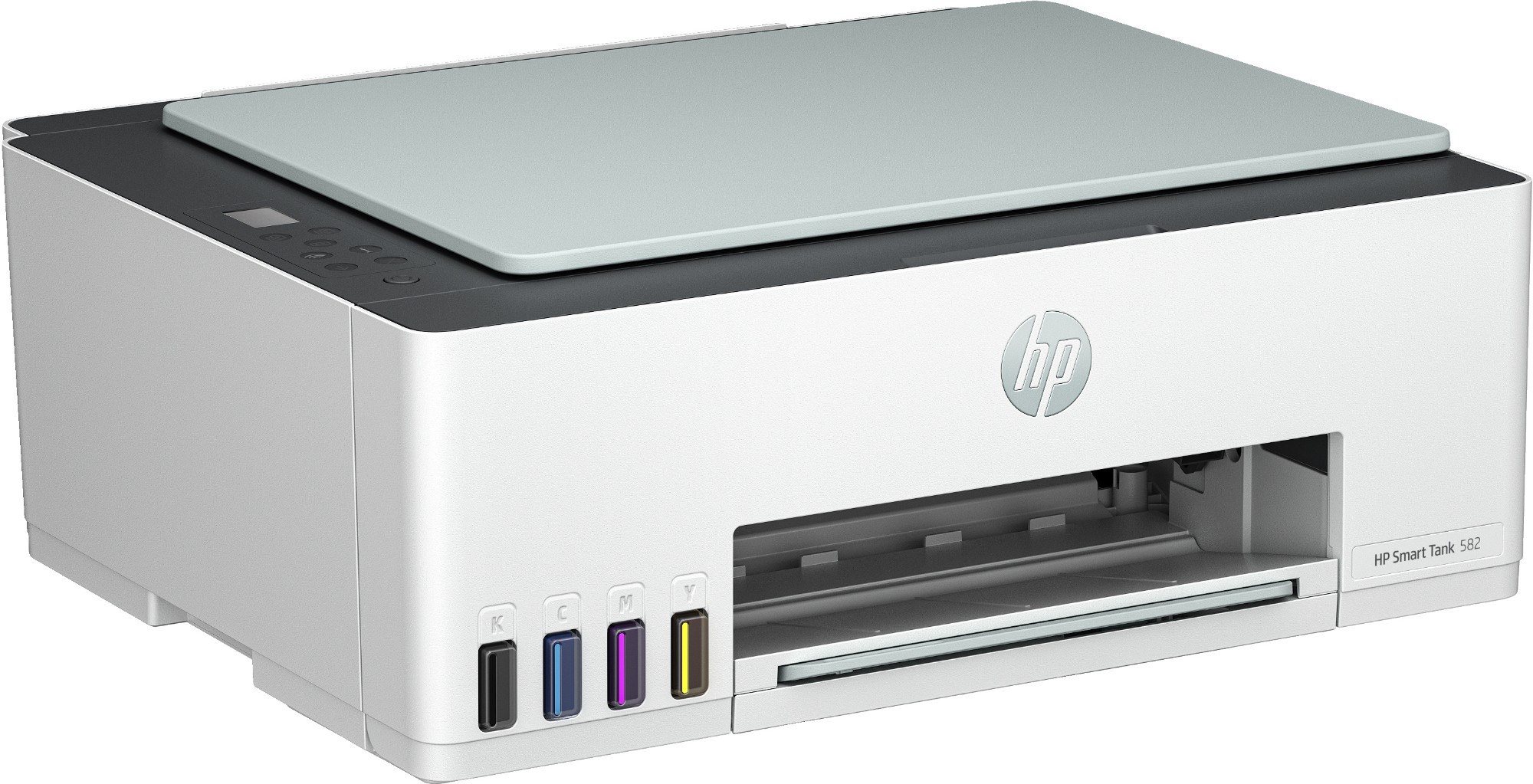 | Zawartość opakowania | Urządzenie wielofunkcyjne HP Smart Tank 582; 3 x butelka z oryginalnym czarnym atramentem HP GT53XL 135 ml (1VV21A); Butelka z oryginalnym błękitnym atramentem HP GT52 50 ml (6ZE03A); Butelka z oryginalnym purpurowym atramentem HP GT52 50 ml (6ZE04A); Butelka z oryginalnym żółtym atramentem HP GT52 50 ml (6ZE05A); Oryginalna głowica drukująca HP, czarna; Oryginalna głowica drukująca HP, trójkolorowa; Instrukcja instalacji; Przewodnik referencyjny; Ulotka ostrzegawcza dot. atramentu; Ulotka dotycząca przepisów; Ulotka dotycząca gwarancji; Przewód zasilający; Więcej informacji dotyczących napełniania i wydajności można znaleźć na stronie https://www.hp.com/go/learnaboutsupplies |
