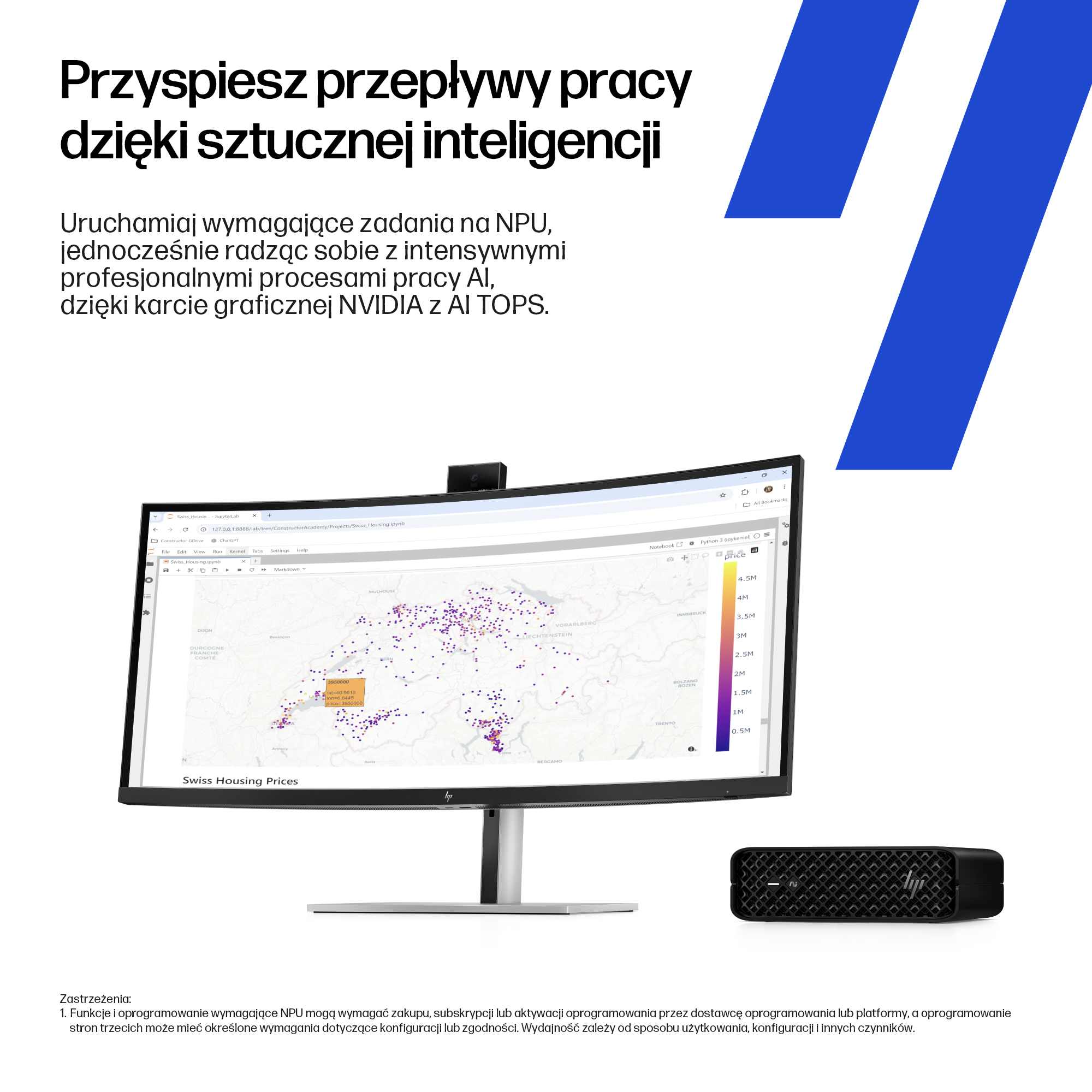 Przyspiesz przepływy pracy związane ze sztuczną inteligencją, dzięki stacji roboczej Z2 Mini G1i AI. Iteruj i rozwiązuj problemy szybciej na swoim lokalnym urządzeniu, dzięki wydajnemu oddzielnemu procesorowi graficznemu zapewniającemu AI TOPS, podczas gdy wbudowany NPU[4] przejmuje zadania związane z produktywnością.