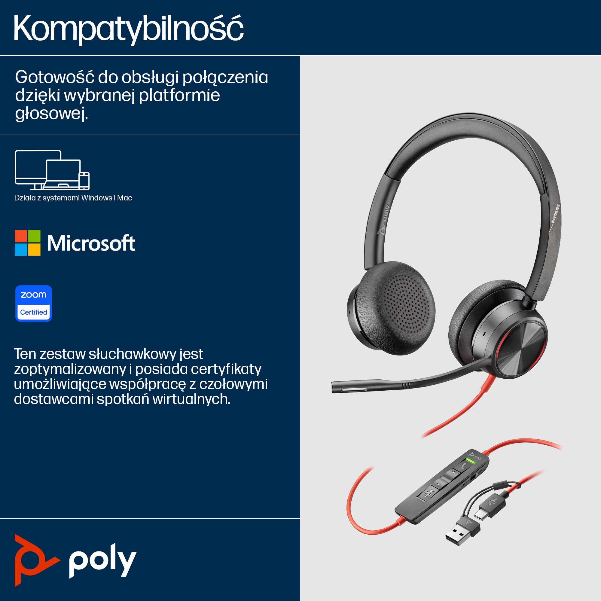 HP Poly Zestaw słuchawkowy Poly Blackwire 8225 Stereo USB-C z certyfikatem Microsoft Teams + przejściówka USB-C/A